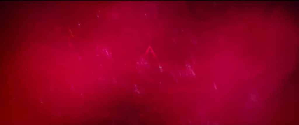 The scene at this point is colored cool and deep blue, soft, giving off a tranquil vibe. As Jesse hones her focus on the triangle image, this tranquility overtakes her. Secure in herself, she starts to walk, emerging from a doorway that itself is yet another triangle. As she nears the end of the runway, the triangle image occupies even more of her focus, it grows bigger, rises up to meet her, and fills the entire screen as well as Jesse’s perspective, causing her entranced expression to change to one of muted shock bordering on fear.