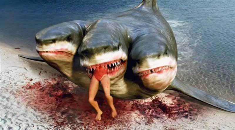 Producers began realizing that if you wanted to change the shark movie at this stage of the game, you had to change the shark itself. So you mate it with a prehistoric reptile (DINOSHARK), or another sea creature (SHARKTOPUS), or you give it two heads (2-HEADED SHARK ATTACK), or three (3-HEADED SHARK ATTACK), or you make its death irrelevant (GHOST SHARK), or give it the ability to travel on land (SAND SHARKS, SNOW SHARKS) or really anything else you could think of (SHARKNADO). With new sharks came new and exaggerated ways to kill, and very quickly the shark genre turned into a sort of one-upmanship of death, the way each new FINAL DESTINATION movie has to get a little more nuts than the last. In 2-HEADED, I wishboned a few people, took out a married couple at the same time, and even interrupted a menage a trois with a shark attack because it fell in line with the gimmick. As a writer, it was pretty liberating. I’ve killed at least 50 people by shark attack; it’s not easy to get inventive with your standard shark. But when the laws of science and nature went out the window, that all changed. However so did the timbre of the shark movie. For all the increased gore and hilarity, a lot of seriousness and real-world terror inherent to the genre was depleted, a lot, and shark movies started getting a reputation that was campier than frightening.